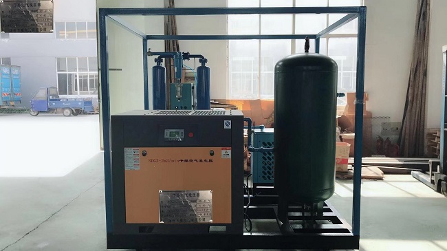 大气经空压机进入储气罐,大部分水分被压缩液化经排水阀排出,空气进行良好次干燥;之后进入冷冻式干燥机,水气被凝结成水,空气进行第二次干燥;然后进入吸附式干燥机进行第三次干燥,将剩余微量水份吸附掉,蕞后经过高精度空气过滤器输送至需要干燥气体的设备中。