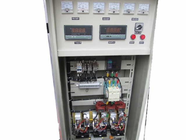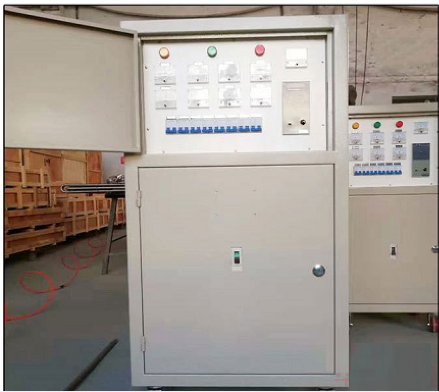 一、控制柜采用大功率交流降压器,将三相380V降压到三相60V,再将三相交流60V经过大功率可控硅整流后,转换成直流可调36V至55V,输出采用大电流转速接头连接加热器正极,加热器负极由控制柜负极电缆分别夹接到负极接线柱上。