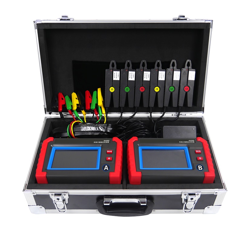 SDSX-4480无线三相相位伏安表,用于变电站内不同位置的三相电力参数测量、PT无线核相、PT负荷测试、CT负荷测试、三相不平衡度测试、谐波分析等。仪表由2台手持终端、6个电流钳、2组电压测试线等组成,2台手持终端具有无线通讯及GPS通讯,可互设为主机或从机,实现同步测量变电站内不同位置之间电流、电压、相位等参数。