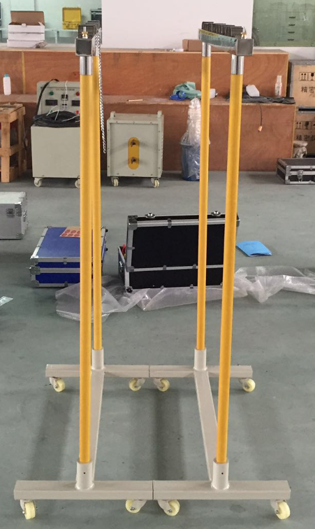 1、根据试品绝缘杆规格调整好两各绝缘杆固定架之间的距离,试验架上的高压连接电极和接地电极,分别使用高压连接棒和接地线钳与高压试验电源和接地排连接。
